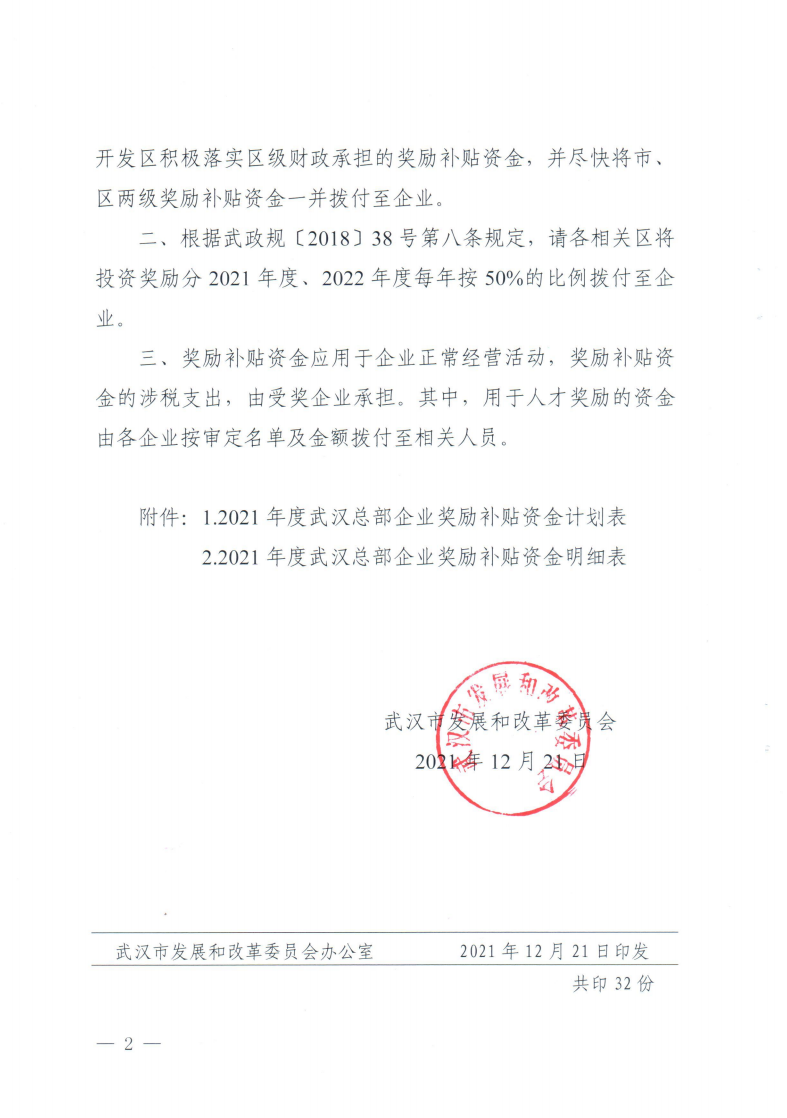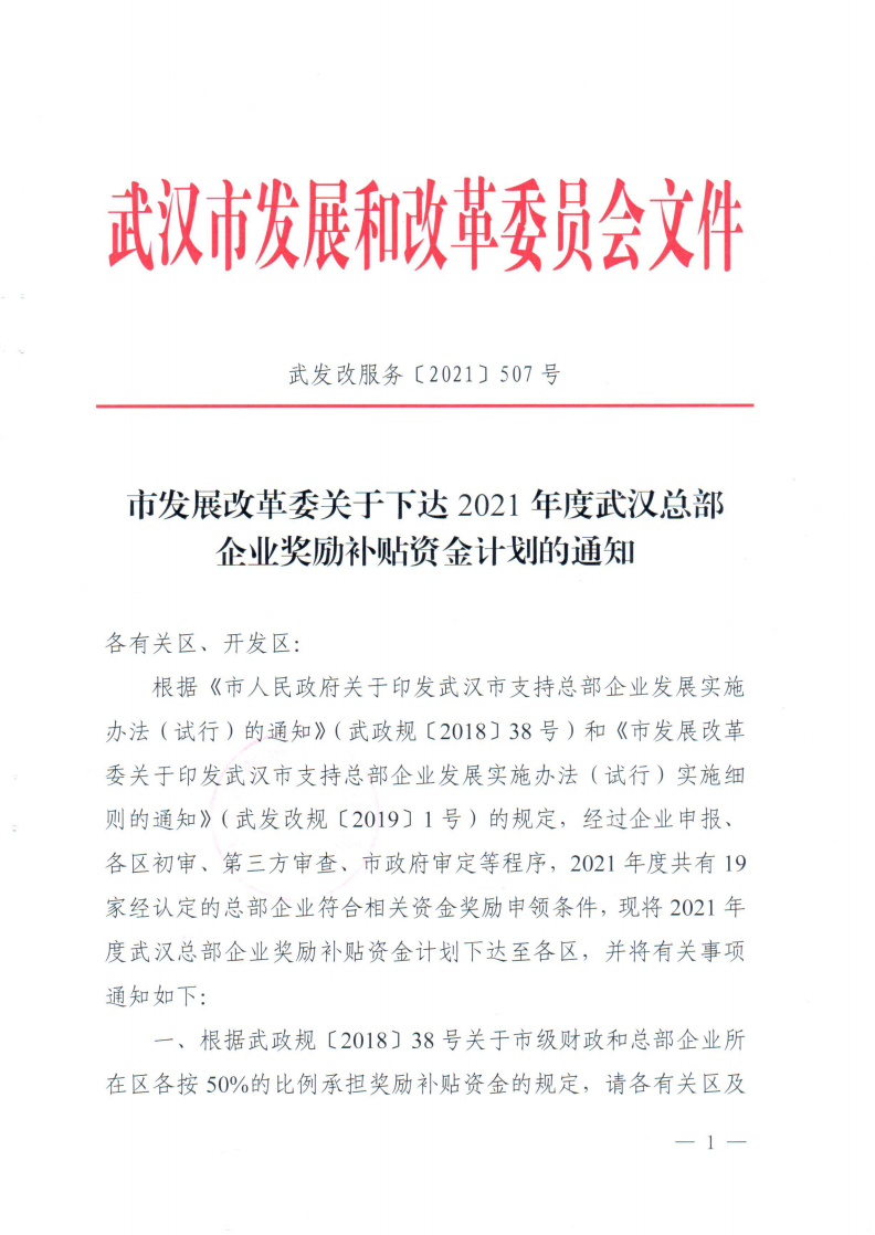 市發(fā)展改革委關于下達2021年度武漢總部企業(yè)獎勵補貼資金計劃的通知